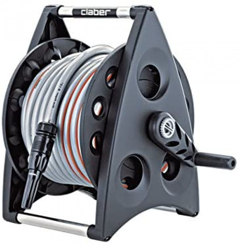 Modern design and state-of-the-art practicality for this compact hose reel, which can be hung from the wall with the specific brackets or transported wherever you wish, resting it stably on the ground. Offered in a small, easy to transport case, it assembles quickly without tools and is complete with 20 metres of hose, jet spray nozzle, 3/4″ tap connector with 1/2″ reducer, 4 automatic couplings, one with Aquastop, which allows you to connect and disconnect the spray nozzle without having to shut off the tap.