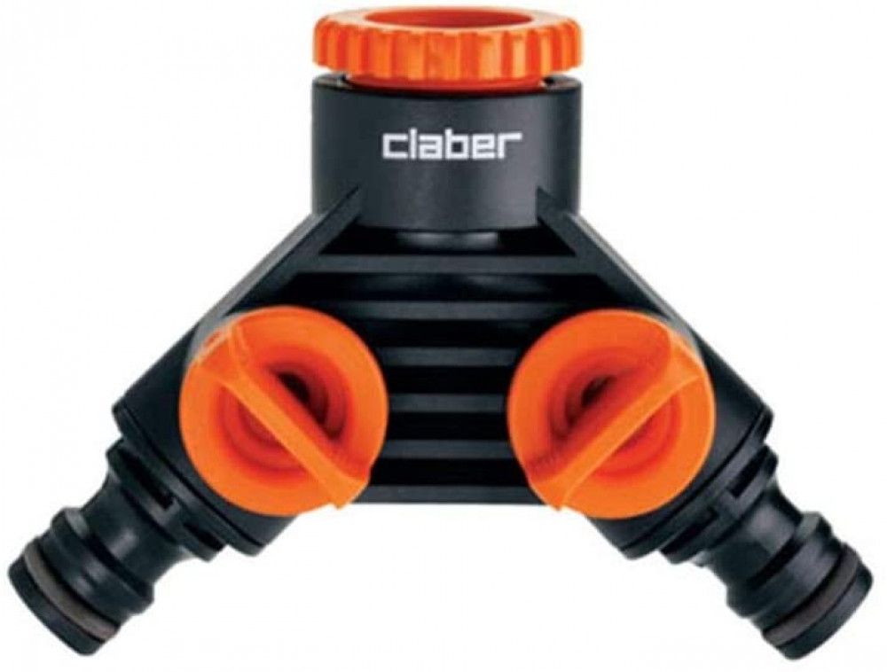 To connect 2 hoses at the same time to the tap. Includes on/off valves and washer. Easy attachment by simply screwing on with 3/4” thread and a reducer to 1/2” thread. Claber looks after all your green or flowering plants, making it easy and without wasting water. What do you want to water? Claber have the solution for every plant. Product Features Brand: Claber Model Number: 8599 Type: Other Color: Black/Orange Outlet Tap 3/4 – 1/2 F 2 Way