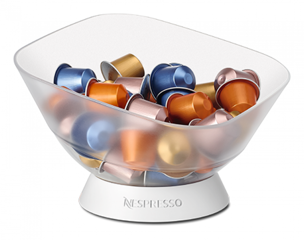 Transparent rocking capsule dispenser*. Capacity: 60 capsules (supplied without capsules) *The bowl is made of PMMA (Polymethyl – methacrylate) and the base is made of MMA (Methyle – methacrylate).