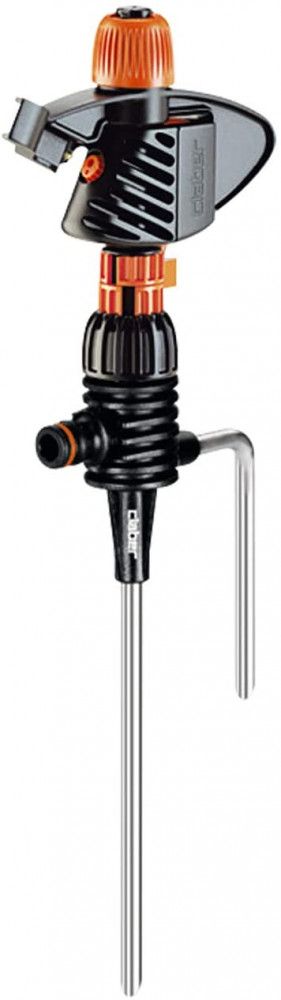 “25 m 27 m 24 m Pulsating sprinkler head providing 0° to 360° circle coverage or continuous rotation, mounted on steady twin-point stake