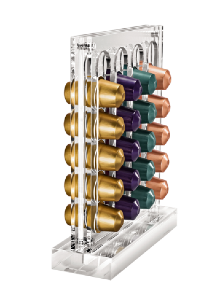 A compact, transparent and versatile capsule dispenser designed to easily store and display your favourite Nespresso capsules (up to 40 capsules, supplied without capsules). This capsule dispenser is made of PMMA (polymethyl-methacrylate) and contains magnets. Dimensions: 21 x 7 x 25cm – Supplied without capsules.