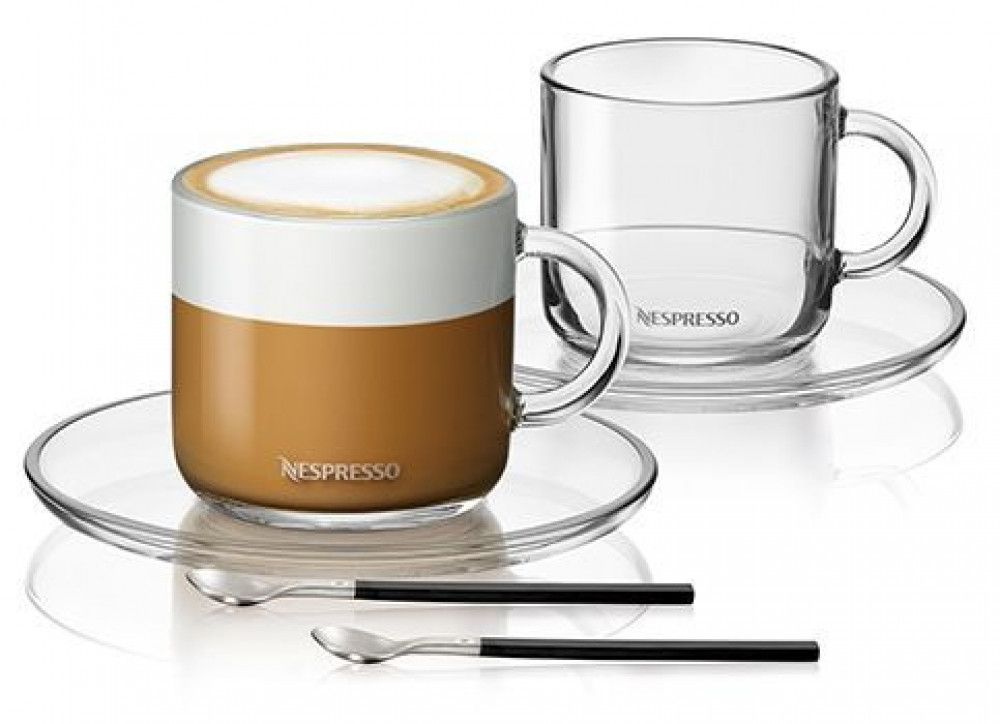 Enjoy a classic cup of cappuccino with this stylish set. The clear glass design showcases the exception look and extraordinary taste of our coffee with milk – leaving room for a generous layer of milk froth. Each set includes: two cups, two saucers and two spoons. Cups 180ml, spoons 12cm long.